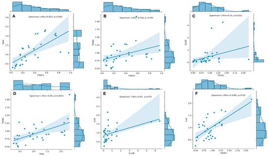 We conducted Spearman’s rank correlation analyses and found a strong positive correlation between the expression of FOXP3 and TNFA (Spearman’s rho = 0.813, p < 0.001, Figure 2A). Additionally, we found a moderate correlation between the expression of TGFB1 and FOXP3 (rs = 0.556, p = 0.001, Figure 2B), IL12B (rs = 0.540, p = 0.002, Figure 2C), and TNFA (rs = 0.590, p < 0.001, Figure 2D). Furthermore, our analysis revealed moderate to low correlations between expression of IL18 and IL12B (rs = 0.450, p = 0.011, Figure 2E) and TGFB1 (rs = 0.438, p = 0.014, Figure 2F).