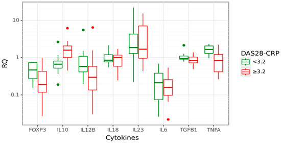 Box plot displaying gene expression in relative quantity (RQ) among RA patients with low (green) disease activity, DAS28-CRP < 3.2 (26% of all cases; n = 8) and high (red) disease activity, DAS28-CRP ≥ 3.2 (74% of all cases, n = 24). The line denotes the median values; boxes, the lower (Q1) and upper (Q3) quartiles; whiskers, minimum and maximum; and single point, outliers. The log scale is used for the Y-axis.
