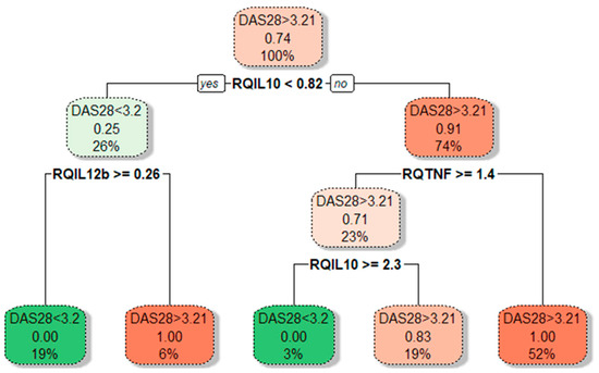 Tree plot showing decision boundaries distinguishing lower- and higher-activity RA patients (green and red) based on their cytokine gene expression levels. Tree plot uses thresholds of cytokine mRNA levels to produce optimal separation of RA patients in the final leaf nodes based on a boolean operator (YES/NO). The predominant class is depicted on every branch and leaf node; under it, the proportion of DAS28 > 3.2 from RA patients in that node; at the bottom, the percentage of patients in that particular branch or leaf node from the total patient count.