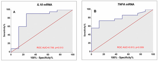ROC Curves display the performance of IL10 (A) and TNFA (B) mRNA levels in discriminating between low disease activity/remission and high-activity RA patients. The area under the curve (ROC AUC) and p-value are depicted on the graphs.