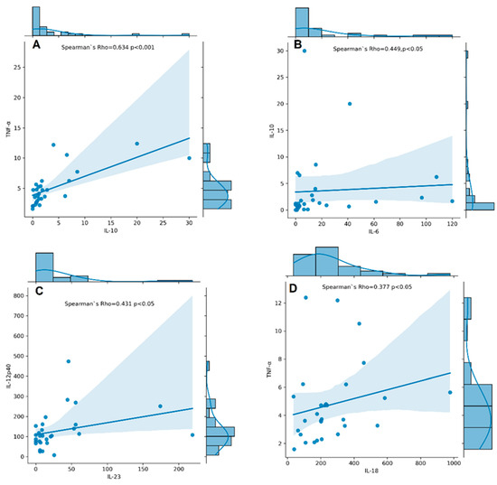 Serum levels of IL-6, IL-10, IL-12p40, IL-17A, IL-18, IL-23, TNF-α, and TGF-β1 were measured in RA patients. TNF-α, IL-12p40, IL-17A, IL-18, IL-6, IL-23, IL-10, and TGF-β1 were detectable in all RA patients, whereas IL-6, IL-10, and IL-23 had detectability of 89%, 93%, and 83%, respectively. The concentrations of cytokines assayed in serum samples of RA patients are shown in Supplementary Table S1. We found a significantly strong correlation between serum levels of IL-10 and TNF-α (rs = 0.634, p < 0.001, Figure 6A) and a moderate one between IL-10 and IL-6 (rs = 0.449, p < 0.05, Figure 6B), IL-12p40 and IL-23 (rs = 0.431, p < 0.05, Figure 6C), and IL-18 and TNF-α (rs = 0.377, p < 0.05, Figure 6D).