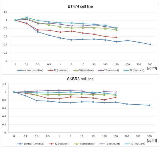 Diagrams presenting changes in proliferation rates at different time points of the experiment during the whole time of cell exposure to trastuzumab. The charts represent the relationship between drug dose (“[g/mL]”axis) and proliferation intensity (y-axis) presented as a decimal fraction of the proliferation of drug-treated cells compared to the control untreated cells and are based upon proliferation assay measurements, with each curve corresponding to a particular time point. “Control” means cells purchased from ATCC and confirmed to be trastuzumab sensitive and able to develop resistance. Control cell lines were not treated with the drug at any time in the experiment and reaction for the drug was stable. T2, T4, T5, and T7 were treated at for 2, 4, 5, and 7 months, respectively. The time points were selected based on the significant increase in proliferation rates (decreased reaction for the drug) to the previous month, reflecting a gradual development of resistance to trastuzumab.