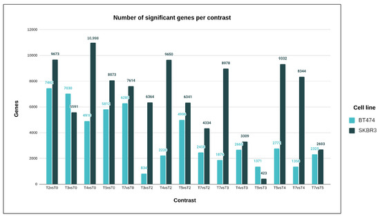 This disparity could be attributed to a significant imbalance in the number of significant transcripts found in both cell lines, with SKBR3 having more relevant genes identified as compared to BT474. In the second part of the statistical analysis, once the global null hypothesis of no change in expression levels across time was rejected for a gene, pairwise comparisons between all time points were conducted for that gene separately for each cell line (Table S1). The comparisons between T2 vs. T0 and T3 vs. T0 yielded the most statistically significant results, indicating that the most important global gene expression changes occurred at the beginning of trastuzumab treatment. This was followed by a temporary decrease in activity at T3, with more balanced gene expression modifications thereafter. Similar trends were observed in SKBR3 (Table S2), with the largest changes in gene expression occurring at the start of Herceptin exposure and a secondary increase in activity at T4. Pairwise comparisons are presented in (Figure 4).