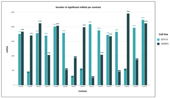 Statistical analysis was used to examine microRNA expression changes in two cell lines, BT474 and SKBR3, during the development of drug resistance. Pairwise comparisons between different time points were conducted for each microRNA with a statistically significant test of the global null hypothesis of no change in expression across time (Figure 5). In the BT474 cell line, the T7 vs. T5 comparison showed statistically significant results for 88.2% of microRNAs, and 12.7% for T4 vs. T2. In the SKBR3 cell line, the T5 vs. T4, T4 vs. T0, and T7 vs. T5 comparisons yielded the highest significant results (96.8%, 83.5%, and 83.4%, respectively), while T7 vs. T2 yielded the lowest fraction of 11.8%. Both cell lines displayed a similar pattern of microRNA expression changes, but SKBR3 cells seemed to respond faster to changing conditions than BT474 cells (Table S6).