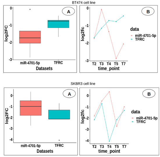 It is important to note that the miRDB predictions are assigned scores ranging from 50 to 100, with higher scores indicating greater statistical confidence in the prediction outcomes. Intriguingly, we observed that among these miRNA-gene pairs, four of the miRNAs and genes belonged to the top 25 genes and miRNAs with the most statistically significant changes identified in both cell lines. To gain deeper insights into the regulatory dynamics at play, we conducted an analysis of the association between miRNA-gene target pairs (miR-4701-5p-TFRC in Figure 6, figures for the remaining pairs from (Table 7) are presented in Supplementary Figure S17), and the distribution of log2 fold change (log2FC) values at their respective time points (Figure 6A) and average of time points (Figure 6B). This allowed us to investigate the extent to which miRNAs exerted control over gene expression within the context of the specific cell line under study.
