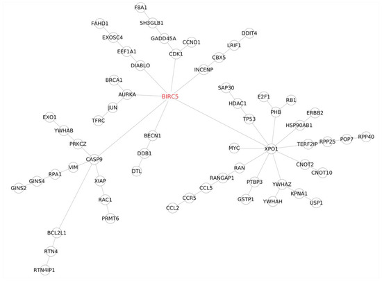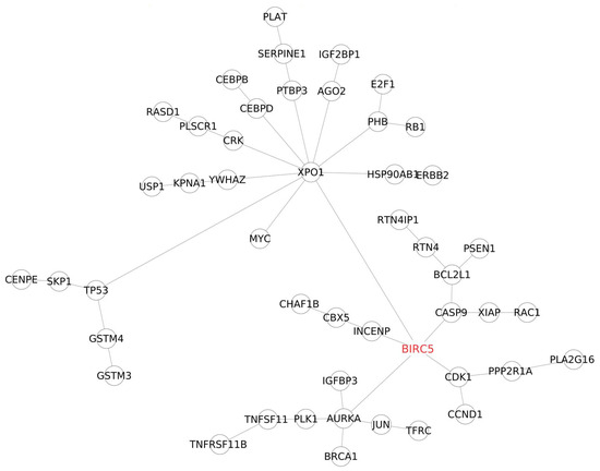 Remarkably, BIRC5, E2F1, and RB1 are pivotal players at the core of these networks, engaging with numerous proteins. As depicted in Figure 7 and Figure 8, BIRC5 forms five direct connections shared across both cell lines: caspase 9 (CASP9), exportin (XPO1), Aurora kinase (AURKA), cyclin-dependent kinase 1 (CDK1), and inner centromere protein (INCENP) [25]. CASP9, linked to apoptosis, AURKA, involved in cell cycle regulation and tumorigenesis, and CDK1, essential for cell cycle progression, are vital contributors. XPO1 stands out due to its multiple connections and its role in regulating protein transport. In SKBR3 cells, BIRC5 also connects directly with DIABLO and BECN1, influencing apoptosis and autophagy [14]. Additionally, BIRC5 interacts indirectly with BRCA1, TFRC, IGFBP3 via AURKA, and RAC1 via CASP9, forming numerous connections via XPO1, including MYC, RB1, E2F1, and IGF2BP1 [14].