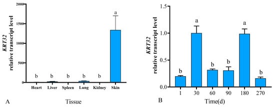 (A,B) indicate the expression results of KRT32 mRNA in different tissues and different skin stages in Gansu Alpine Fine-wool sheep, respectively. The data are expressed as the mean ± S.E. Different letters indicate significant differences between different ages (p < 0.05).