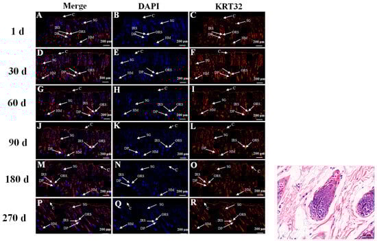 Immunofluorescence staining for K32 in skin tissues of Gansu Alpine Fine-wool sheep at different times (5×). Blue (B,E,H,K,N,Q) and red (C,F,I,L,O,R) tissue in the figure show DAPI-labeled nuclear fluorescence staining and fluorescence staining for K32, respectively. ORS: outer root sheath; IRS: inner root sheath; HM: hair matrix; C: corneum; SG: sebaceous glands; DP: dermal papilla. H&E staining image are shown on the right. The first column (A,D,G,J,M,P) is a combined graph of the second and third columns.
