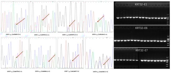 PCR amplification of exons 1, 6 and 7 of KRT32 and sequencing results, overlapping peaks indicate SNPs. The overlapping peaks in the direction of the arrows refer to mutation sites, and the different colored lines represent different bases.
