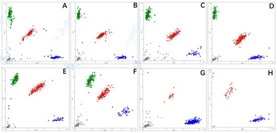 Genotyping results for eight positions of the KRT32 (A–H) gene in Gansu Alpine Fine-wool sheep. Different colors represent different genotypes, with green and blue representing heterozygotes and red representing purities.