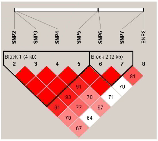 Linkage disequilibrium analysis of SNPs in KRT32. The color of the square indicates the degree of interlocking, and the darker the color, the higher the degree of interlocking; The value represents the strength (percentage) of the correlation value between SNPs.