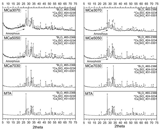 The XRD patterns, which are presented in Figure 2, confirmed the amorphous nature of the powder materials containing MSNs. This amorphous phase increased with the increase in MSNs concentration in the material. The presence of bismuth oxide was the highest (69%) in MTA samples, while a decrease in its presence was noticed with the decrease in MTA concentration, with CaMTA70.30 showing the lowest percentage (33%). The amount of calcium silicate varied between 7% and 14%, with MTA having the highest percentage, and the highest percentage of tricalcium silicate was detected in CaMTA70.30 (36%). In our study, X-ray powder diffraction (XRD) was employed to analyze the crystal structure of the synthesized nanoparticles. To determine the proportion of amorphous and crystalline phases, software tools like Jade 6 and PeakFitWin 1 were utilized. Jade software aided in identifying the crystal structure and phases contributing to the diffraction pattern by comparing the observed peaks with known patterns in its database (PDF cards). Then, using PeakFitWin, a peak fitting analysis was performed to quantify the relative proportions of each phase in the sample, allowing the calculation of the area under each peak and thus determining the proportion of each phase (Table 2).