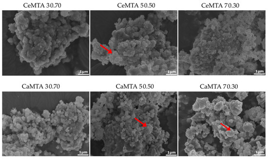 SEM images of the prepared powder samples with MTA. Magnification ×15,000, bar 1 μm.
