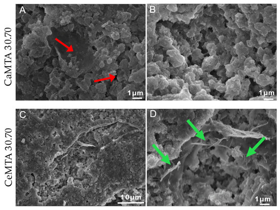 Representative images of human gingival fibroblasts after incubation with representative powder samples with MTA (CeMTA 30.70 and CaMTA 30.70). (A,B) Magnification ×10,000, bar 1 μm, (C) magnification ×10,000, bar 10 μm, (D) magnification ×8000, bar 1 μm.