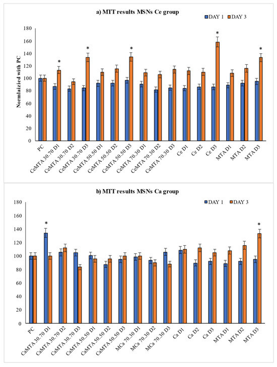 The cytotoxicity results are presented in Figure 5. All groups of materials were incubated for 1 and 3 days accordingly. The statistical analysis showed considerable variations among the groups. In most of the cases, all the tested materials presented non-cytotoxic behavior. Moreover, cell viability revealed an increase on day 3. Cell cultures with Ca/Ce co-doped MSNs mixed with MTA under the ratios CeMTA 30.70 and CeMTA 50.50 showed the most prominent and statistically significant increase (p < 0.05). For the cells treated with the MTA and Ca-doped mesoporous nanoparticles, no statistically significant alterations were recorded.