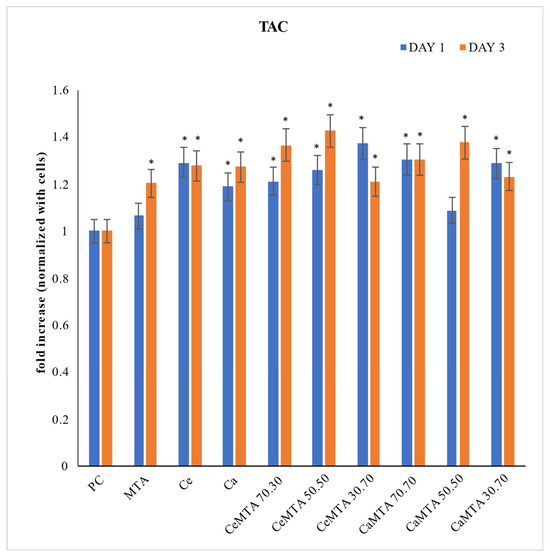 Figure 6 presents the total antioxidant capacity (TAC) of the human gingival fibroblasts (hGFs) after the incubation with the tested materials. The presence of MTA with the hGFs did not negatively affect the antioxidant capacity of the cells. The addition of the nanoparticles was found to boost the antioxidant capability of the cells (p < 0.05) statistically significantly. In more detail, Ca-doped MSNs showed a similar tendency to Ca/Ce co-doped MSNs in terms of increasing the antioxidant properties of the cells (p < 0.05). The capacity of the cells to produce antioxidants was also positively impacted by the combination of MTA and nanoparticles, especially after three days of incubation for the groups with Ca/Ce co-doped MSNs (CeMTA 70.30, CeMTA 50.50).