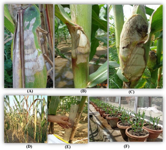 Symptoms of banded leaf and sheath blight (BLSB) on (A) leaf, (B) sheath, and (C) cob. (D) Artificially inoculated disease field. (E) Measurement of lesion length. (F) Treated seeds sown in pots and kept under net house conditions.