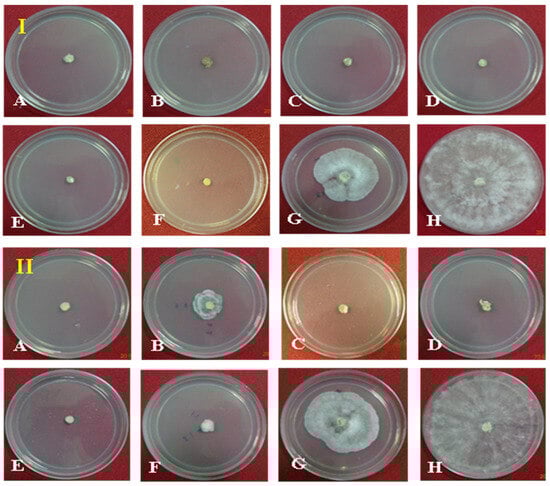 Effect of fungicides (1000 ppm, (I) and 500 ppm, (II)) on redial growth of Rhizoctonia solani f. sp. sasakii in vitro: (A) Hexaconazole, (B) Carbendazim, (C) Validamycin, (D) Tebuconazole, (E) Trifloxystrobin + Tebuconazole (Nativo), (F) Azoxystrobin, (G) Pencycuron, and (H) control (untreated).