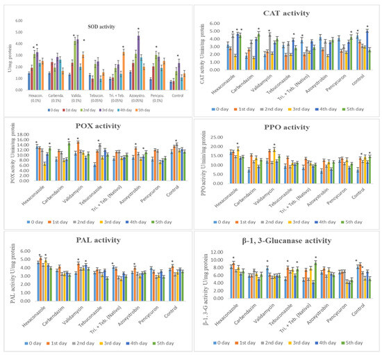 Superoxide dismutase (SOD), catalase (CAT), peroxidase (POX), polyphenol oxidase (PPO), phenylalanine ammonia-lyase (PAL), and β-1,3-glucnase activity in maize (Vivek QPM-9) inoculated with R. solani f. sp. sasakii after fungicide application. Activity recorded at different inoculation days in an of interval 0 to 5th day after inoculation. The post hoc Tukey’s HSD test (p < 0.01) indicates a significant difference (*) in enzyme activity.