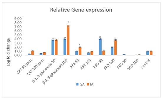 Relative expression of selected defense genes in maize treated with salicylic acid (SA) and jasmonic acid (JA). Enzymes include superoxide dismutase (SOD), polyphenol oxidase (PPO), ascorbate peroxidase (APX), catalase (CAT), and β-1,3-glucanase (β-1,3-gluc). The post hoc Tukey’s HSD test (p < 0.01) indicates a significant difference (*) in gene expression between the samples treated with salicylic acid and jasmonic acid.