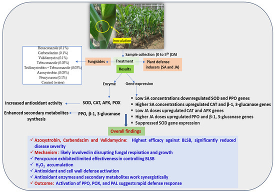 This study reveals the multifaceted interactions between plant defense inducers and the intricate regulation of defense-related genes, providing valuable insights into the complex dynamics of plant responses to varying concentrations of these inducers. The findings contribute to our understanding of the biochemical and molecular mechanisms that govern disease resistance in maize (Figure 5). Our findings offer practical guidance for enhancing maize disease management, specifically against BLSB, by optimizing fungicide selection and application methods. The theoretical implications include advancing our understanding of plant defense mechanisms and plant–fungicide interactions, contributing to the broader agricultural science. However, the limitations include the focus on specific fungicides and enzymes, potentially limiting the generalizability of our findings to broader disease management contexts in maize. Therefore, future research could investigate the synergistic effects of fungicide combinations, integrate biological control methods, and assess the long-term impacts on soil health for sustainable maize disease management.