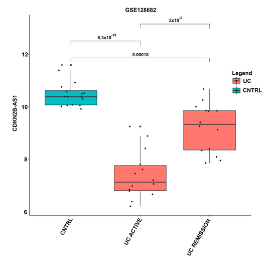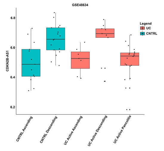 This study highlights the challenges related to performing a lncRNA meta-analysis on a complex disease such as UC. In the publicly available datasets, both the description of the UC disease state and location of the colonic biopsy location differ. UC disease states annotated in the different datasets include active, inactive, macroscopic inflammation, and remission, which may exhibit varying levels of inflammation and were shown to have an influence on lncRNA transcription levels. In this study, the expression of lncRNA CDKN2B-AS1 was significantly downregulated in UC compared to controls but significantly upregulated in UC remission compared to active UC (Figure 1). Grouping UC remission along with active UC samples would reduce the probability of identifying CDKN2B-AS1 as differentially expressed especially after multiple correction. Several lncRNAs exhibited significantly different expression levels across various disease states in this study (Figure S2).
