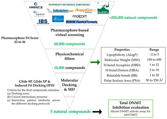 In light of the significance of epigenetic targets at the forefront of the pharmaceutical landscape, our study aimed to discover novel inhibitors sourced from natural origins that target DNA methyltransferases (DNMTs). Employing an integrated pipeline of structural and ligand-based computational approaches, a virtual screening methodology was conducted based on pharmacophore models, coupled with molecular docking and molecular dynamics simulations to establish a precise and robust selection process. Subsequently, the top-ranked compounds were procured and subjected to biological evaluation using the colorimetric DNMT activity assay (ab113467). The observed inhibition of DNA methyltransferase activity ranged from 30–45% at a concentration of 100 µM for the tested compounds.