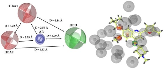 (Left) The features of the optimum pharmacophore model; (right) CM272 DNMT inhibitor (yellow) fitted on the optimum pharmacophore model. The features are depicted with the following color coding: hydrogen bond acceptors (HBA) as red spheres, the hydrogen bond donor (HBD) as a green sphere, the aromatic ring (AR) as a blue ring, and exclusion volumes (Ex. Vol.) as gray spheres. The distances (Å) between the chemical features are illustrated as black lines. The figure was created with LigandScout 4.0 Advanced from InteLigand [25].