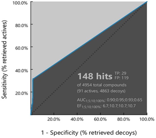 The ability of the derived model to correctly classify the list of compounds as actives or inactive was examined via Receiver Operating Characteristic (ROC) curve analysis (Figure 3). Additionally, Area Under Curve (AUC), Sensitivity (Se), Specificity (Sp), and Enrichment Factor (EF), quantitative key parameters [42,43], were exploited to confirm the validity of the model (Table 1). Finally, the validation of the model was completed by calculating statistical significance variables (Table 1).