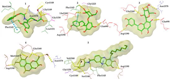 Representative binding poses of the compounds 1–5, derived from Glide-XP. 1: 2-(3-(3,4-dimethoxyphenyl)-3-(2-((2-oxo-2H-chromen-7-yl)oxy)acetamido)propanamido)acetic acid, 2: Phlorizin, 3: Orientin, 4: Bergenin, and 5: 2-[(7,8-dihydroxy-6-undecylphenazin-2-yl)formamido]pentanedioic acid. Hydrogen bonds are depicted with yellow dashed lines and pi-pi interactions are illustrated with blue dashed lines.