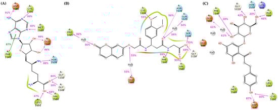 1: 2D ligand interaction diagrams of (A) Sinefungin and the examined compounds indicating the frequency of occurrence of interactions. (B) 1: 2-(3-(3,4-dimethoxyphenyl)-3-(2-((2-oxo-2H-chromen-7-yl)oxy)acetamido)propanamido)acetic acid, (C) 2: Phlorizin, (D) 3: Orientin, (E) 4: Bergenin, and (F) 5: 2-[(7,8-dihydroxy-6-undecylphenazin-2-yl)formamido]pentanedioic acid. Hydrogen bonds and pi-pi interactions are illustrated with pink and green lines, respectively. The figure was created using Desmond software.