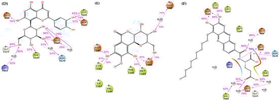 In the case of compound 5, it was revealed that hydrogen bonds are created with the critical amino acids Glu1168 (~60% and 95%), Asp1190 (~95% and 99%), Cys1191 (40%), Asn1578 (~30%), and Val1580 (~35%). Furthermore, the binding is further strengthened through the development of water-mediated hydrogen bonds at particularly high percentages with Glu698 (~90%) and Glu1266 (~60% and ~80%) (Figure 6).