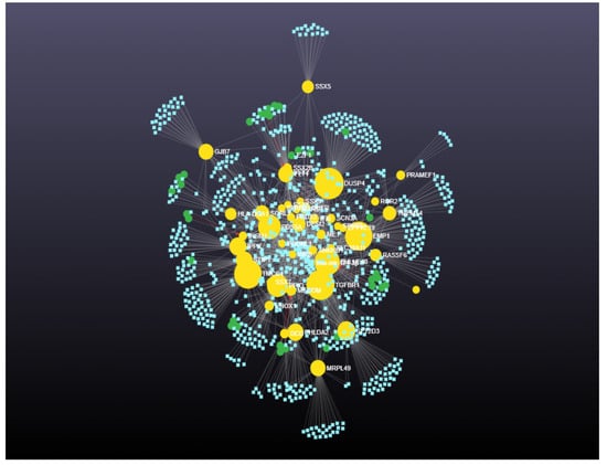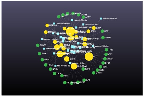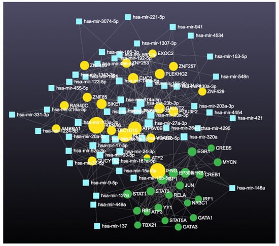 Gene–miRNA interaction networks for upregulated genes including 45 upregulated genes that interacted with 829 miRNAs and 33 transcription factors (p < 0.05). Green circles denote genes. Yellow circles denote transcription factors. Size indicates significance. Blue squares denote miRNAs.