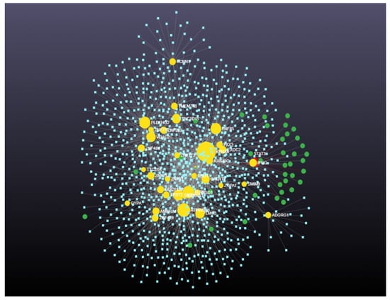 Gene–miRNA interaction network for downregulated genes including 36 downregulated genes that interacted with 1057 miRNAs and 39 transcription factors (p < 0.05). Green circles denote genes. Yellow circles denote transcription factors. Size indicates significance. Blue squares denote miRNAs.