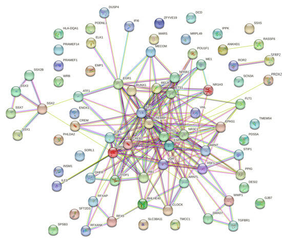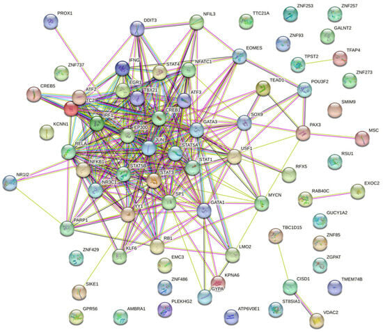 STRING protein–protein interaction (PPI) network. PPI network for the downregulated genes (≥5-fold expression; 73 nodes; 293 edges; PPI enrichment with p < 1.0 × 10−16). The node color represents proteins. The edges represent interactions. Note: Some interacting proteins/transcription factors are common for upregulated and downregulated genes.