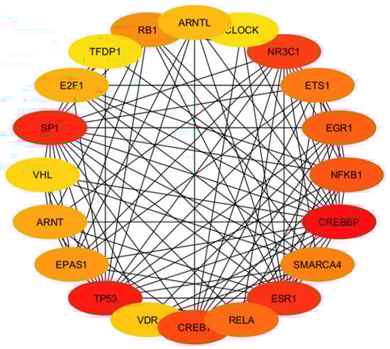 Interactions among hub genes (ARNT, ARNTL, CLOCK, CREBBP, CREBP1, E2F1, EGR1, EPAS1, ESR1, ETS1, NFKB1, NR3C1, RB1, RELA, SMARCA4, SP1, TFD1, TP53, VDR and VHL) of upregulated genes in the protein–protein interaction network. The dark to light colors denotes high to low degrees of expression. Black lines indicate interactions between genes.