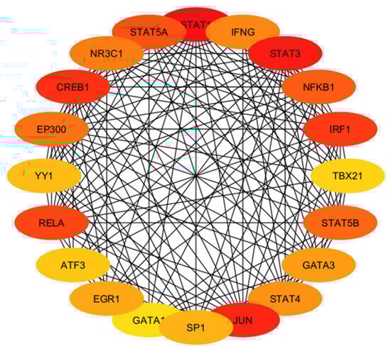Interactions among hub genes (ATF3, CREB1, EGR1, EP300, GATA1, GATA3, IFNG, IRF1, JUN, NFKB1, NR3C1, RELA, SP1, STAT1, STAT3, STAT4, STAT5A, STAT5B, TBX21, and YY1) of downregulated genes in the protein–protein interaction network. The dark to light colors denotes high to low degrees of expression. Black lines indicate interactions between genes.