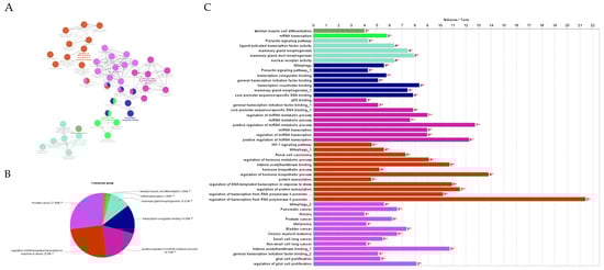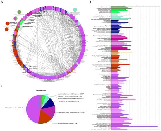 ClueGO analysis of upregulated genes. (A) Functionally grouped network with terms as nodes linked based on their kappa score level (≥0.4), where only the label of the most significant term per group is shown. The node size represents the term enrichment significance. Functionally related groups partially overlap. The grey color gradient shows the gene proportion of each cluster associated with the term. (B) Overview chart with functional groups including specific terms for upregulated genes. ** p < 0.001. (C) GO/pathway terms specific for upregulated genes. The bars represent the number of genes (in red) associated with the terms. The percentage of genes per term is shown as a bar label.