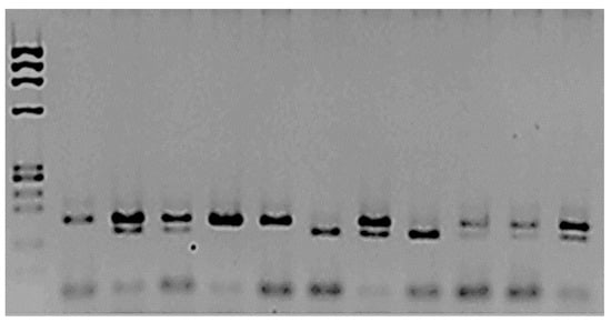 For the analysis of the SNP rs1051740 (mEPH), Cheng S.L. et al.’s protocol was used [35]. Briefly, DNA (20 ng) was mixed with a 40 µL reaction mixture containing 1.5 mM MgCl2, 100 ng of each primer, 500 µM deoxyribonucleoside triphosphate, and 0.6 IU Taq DNA polymerase (Promega®). The DNA was amplified via polymerase chain reaction (PCR) using a thermal cycler Minicycler™ (MJ Research, Waltham, MA, USA) consisting of an initial single cycle of 10 min at 95 °C, followed by 35 cycles of 30 s at 94 °C, 20 s at 52 °C, and 5 s at 72 °C. Then, PCR products were treated with Eco RV (Promega®). The digested samples were then loaded on an ethidium bromide-stained 2.5% agarose gel, and the products were visualised using UV transillumination. RFLP products are for wild homozygous TT genotypes: two bands: 140 pb/22 pb; for heterozygous CT: 162 pb/140 pb/22 pb; and for the mutated homozygous, CC 162 pb. The molecular weight marker was the Hae III digested ΦX174 (Promega®).