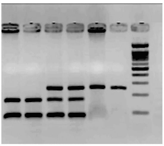 The molecular weight ladder (ΦX174/Hae III) is the last column. The rest corresponds to PCR products treated with the enzyme Dpn II. Columns 1 and 2 correspond to two TT: mutated homozygous 160 bp/88 bp. Columns 3 and 4 correspond to GT heterozygous 248 bp/160 bp/88 bp, and columns 5 and 6 to GG wild-type homozygous, 248 bp.