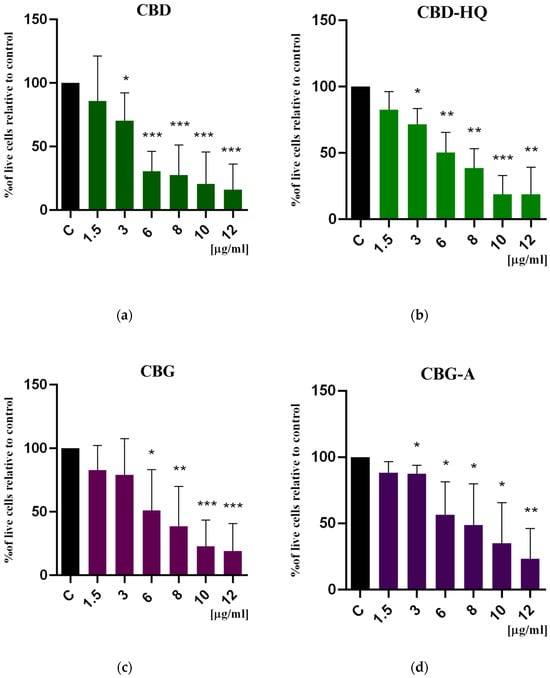 Bęben, D.; Siwiela, O.; Szyjka, A.; Graczyk, M.; Rzepka, D.; Barg, E.; Moreira, H. Phytocannabinoids CBD, CBG, and their Derivatives CBD-HQ and CBG-A Induced In Vitro Cytotoxicity in 2D and 3D Colon Cancer Cell Models. Curr. Issues Mol. Biol. 2024, 46, 3626-3639. https://doi.org/10.3390/cimb46040227