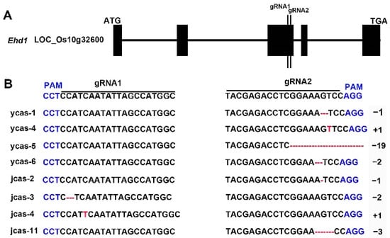 To assess the phenotypic consequences of the new ehd1 mutations and eliminate selective marker genes and T-DNA elements, T0 progeny plants underwent DNA sequencing and were self-pollinated to produce T1 progeny. T2 progeny, either homozygous for ehd1/ehd1 or free of T-DNA, were subjected to phenotypic screening and genotyping (Figure S2). The sequencing analysis identified deletions or insertions at the predicted editing sites in ycas-1, ycas-4, ycas-5, ycas-6, jcas-2, jcas-3, jcas-4, and jcas-11, potentially leading to altered protein functions (Figure 1B).