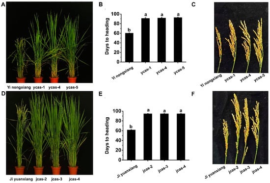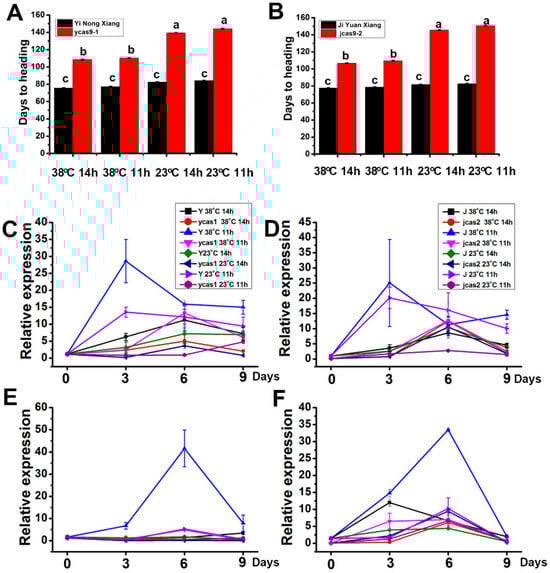 To investigate the effects of ehd1 mutations on photoperiod and temperature responses, experiments with ycas-1 and jcas-2 mutants were conducted. The results show that variations in photoperiods and temperatures impacted the mutants differently from the WT (Figure 3 and Figure 4A,B). Both ycas-1 and jcas-2, along with the WT, demonstrated temperature sensitivity; notably, ycas-1 and jcas-2 exhibited extended basic vegetative growth periods at 23 °C compared with 38 °C. Similarly, under photoperiod treatments, these mutants showed marginally longer basic vegetative growth periods under 11 h light conditions than under 14 h light conditions (Figure 3 and Figure 4A,B).