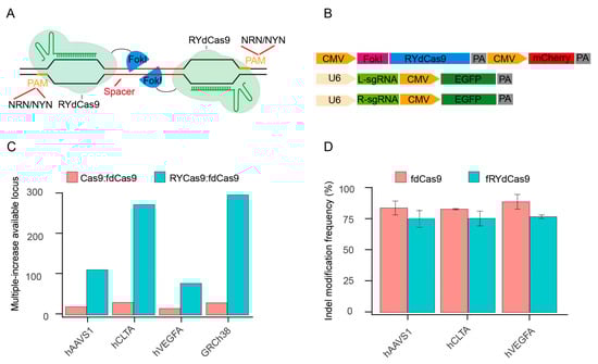 To characterize fRYdCas9, we constructed it based on the structure of fdCas9 and vectors expressing independent sgRNAs (Figure 1A,B). As FokI forms a dimer to facilitate DNA cleavage, the left and right sgRNAs (L- and R-sgRNA) are required to guide the RYdCas9/dCas9-FokI complex in fRYdCas9 and fdCas9. For the PAM restriction, fRYdCas9 employs NRN/NYN like RYCas9, while fdCas9 uses two NGG PAMs (Figure S1A). Based on the distinct PAM usage rules, we observed that the ratio of available targeting loci for Cas9 to fdCas9 and fRYdCas9 to fdCas9 was approximately 30 and 100–300 times more, respectively (Figure 1C and Table S1).
