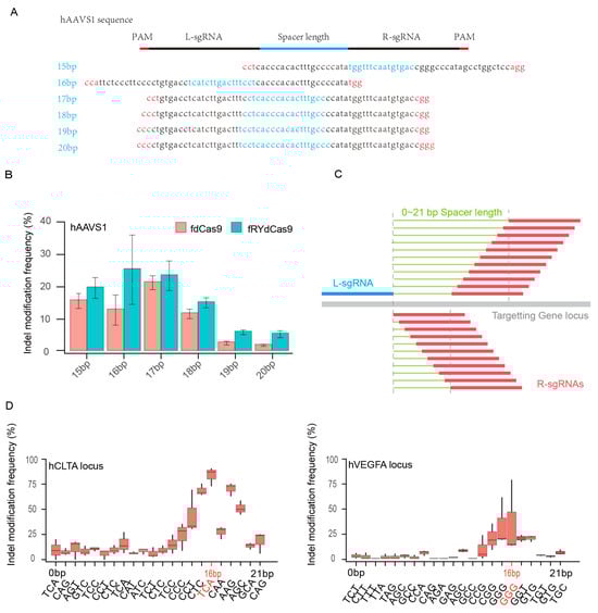 The evaluation of spacer length for fRYdCas9. (A) Schematic diagram showing the spacer lengths of 15–20 bps for fRYdCas9 at the hAAVS1 site. (B) Indel modification frequency with increasing spacer lengths for fRYdCas9 at the hAAVS1 site. fRYdCas9 with various spacer lengths and two sgRNAs vectors were co-transfected to HEK293T. fRYdCas9 fdCas9 served as the control. (C) Schematic of the gradually increasing spacer length of 0–21 bps for fRYdCas9. (D) Indel modification frequency by varying spacer lengths for fRYdCas9 at the hCLTA1 or hVEGFA sites.