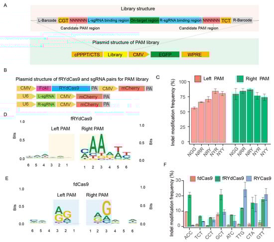 The PAM restriction of fRYdCas9 and RYCas9. (A) Structure diagram of the PAM library. The library was assembled by the candidate PAM region, left and right sgRNA (L/R-sgRNA), on-target region, and barcodes. The vector structure for the PAM library is linked with EGFP. The library was packaged into lentivirus, transfected to the HEK293T, and selected by EGFP+ cells. (B) Vector structure of editor and sgRNAs. They were linked with mCherry and were co-transfected with the PAM library vector into HEK293T cells. (C) Indel modification frequency of fRYdCas9 on various PAM patterns. (D) PAM features of fRYdCas9. (E) PAM features of fdCas9. (F) Indel modification frequency of fRYdCas9 by NYN PAMs.