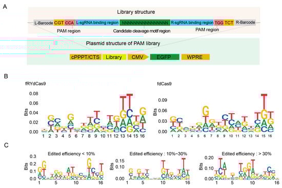 fRYdCas9 shows no specific motif in the editing window. (A) Structure diagram depicting the motif library of editing windows. The on-target region is assembled by a random 16-nt library. Vectors were packaged with lentivirus and co-transfected into HEK293T cells. The fdCas9 served as the control. (B) The motif probability in the editing window for fRYdCas9. (C) Motif preference in the editing window for fRYdCas9 based on editing efficiency.