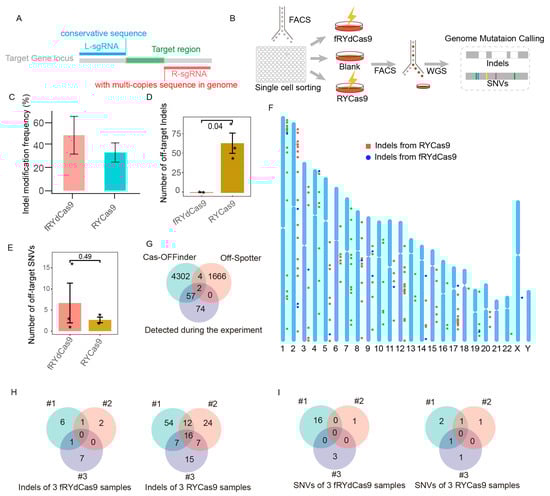 fRYdCas9 exhibits a significant reduction in off-target effects. (A) Schematic of sgRNAs simultaneously targeting multi-copy sequences by fRYdCas9. (B) Diagram illustrating the setup for the whole-genome sequencing (WGS) process. fRYdCas9 and two sgRNAs vectors were co-transfected to K562 cells. fdCas9 served as the control. (C) The indel modification frequency of fRYdCas9 and RYCas9 on the tested locus. (D,E) The number of indels and single nucleotide variants (SNVs) for fRYdCas9 and RYdCas9. (F) The distribution of off-target sites for fRYdCas9 and RYCas9 across the genome. (G) Comparison between predicted (Cas-OFFinder and Off-Spotter) and WGS-detected off-target sites for sgRNAs with high off-target effects. (H,I) Analysis of indels and SNVs between fRYdCas9 and RYdCas9. Data are presented as means ± SEM. * p < 0.05, n = 3 (Mann–Whitney).