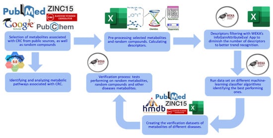 The metabolite datasets used in this study were extracted from public sources and two databases, the Human Metabolome Database (HMDB), version 5.0 [6,7] and ZINC-22 [8]. The software used for machine learning was as follows: Waikato Environment for Knowledge Analysis (WEKA), version 4.2 [9], ChemDes, version 1.5 [10], and MetaboAnalyst, version 5.0 for the analysis of metabolic pathways [11,12]. The flowchart of the methods used in this study is shown in Figure 1.