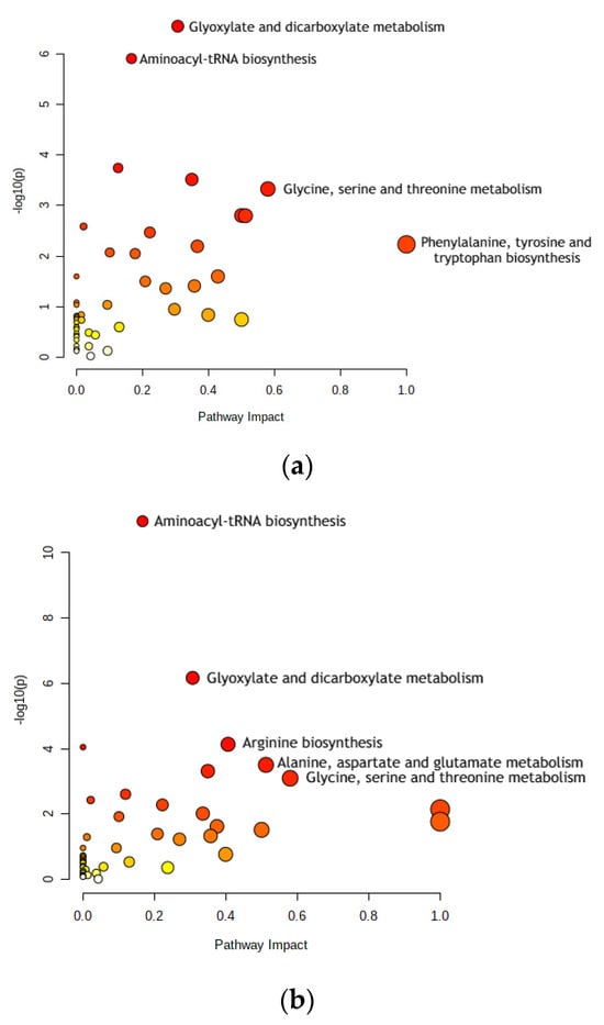 Dot plots for metabolic pathway analysis. Along the X-axis is pathway impact, and along the Y-axis is significance (p-value). The node size reflects significance, and the node color reflects pathway impact—the brighter the color, the greater is impact. The most significant pathways are labeled. (a) Stage 0–2 pathways: aminoacyl-tRNA biosynthesis; glyoxylate and dicarboxylate metabolism; glycine, serine, and threonine metabolism; and phenylalanine, tyrosine, and tryptophan biosynthesis. (b) Stage 3–4 pathways: aminoacyl-tRNA biosynthesis; glyoxylate and dicarboxylate metabolism; arginine biosynthesis; alanine, aspartate, and glutamate metabolism; and glycine, serine, and threonine metabolism. Pathway impact indicates how a series of actions among molecules in a cell might result in a change or specific product in a cell.